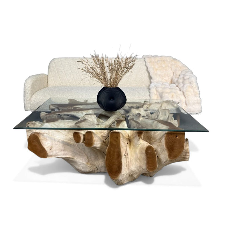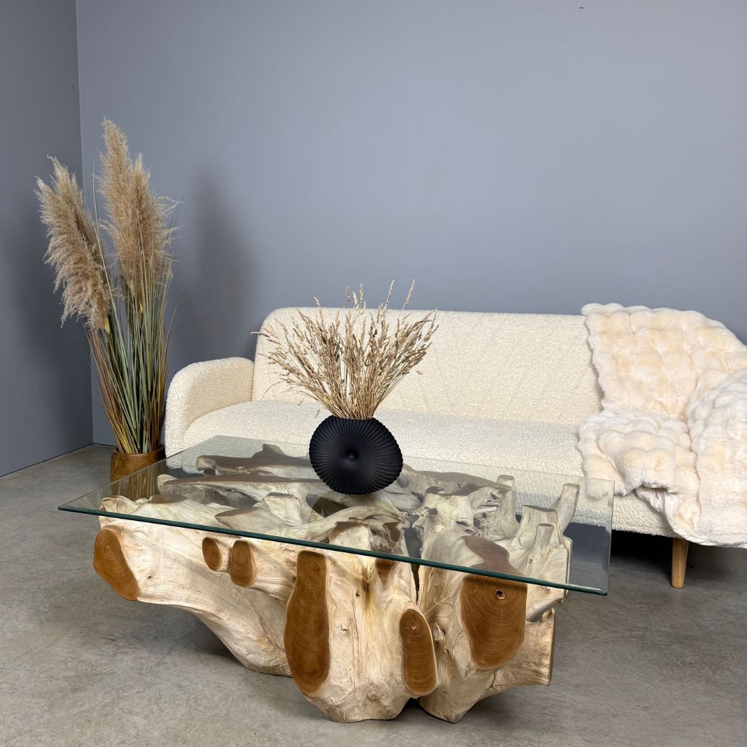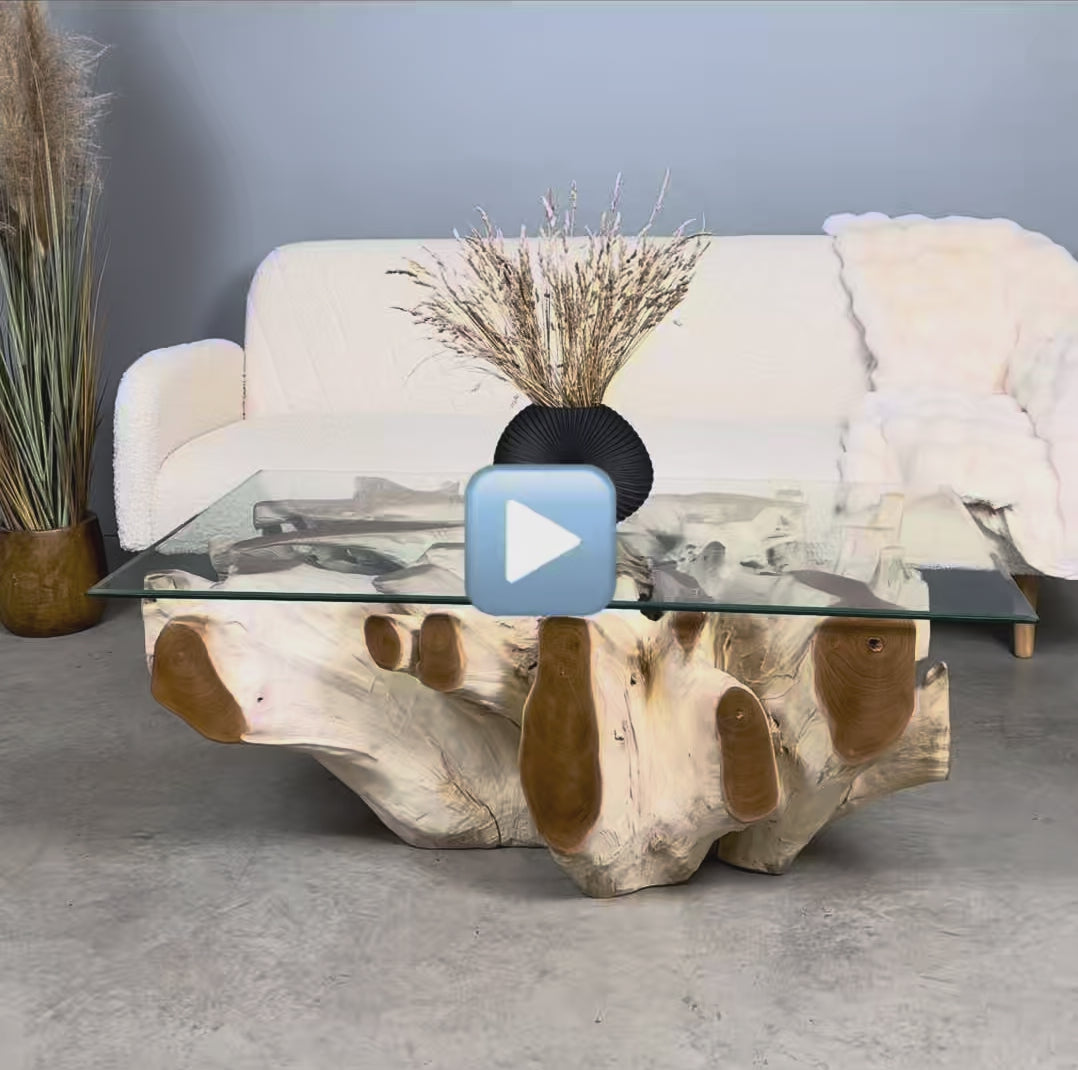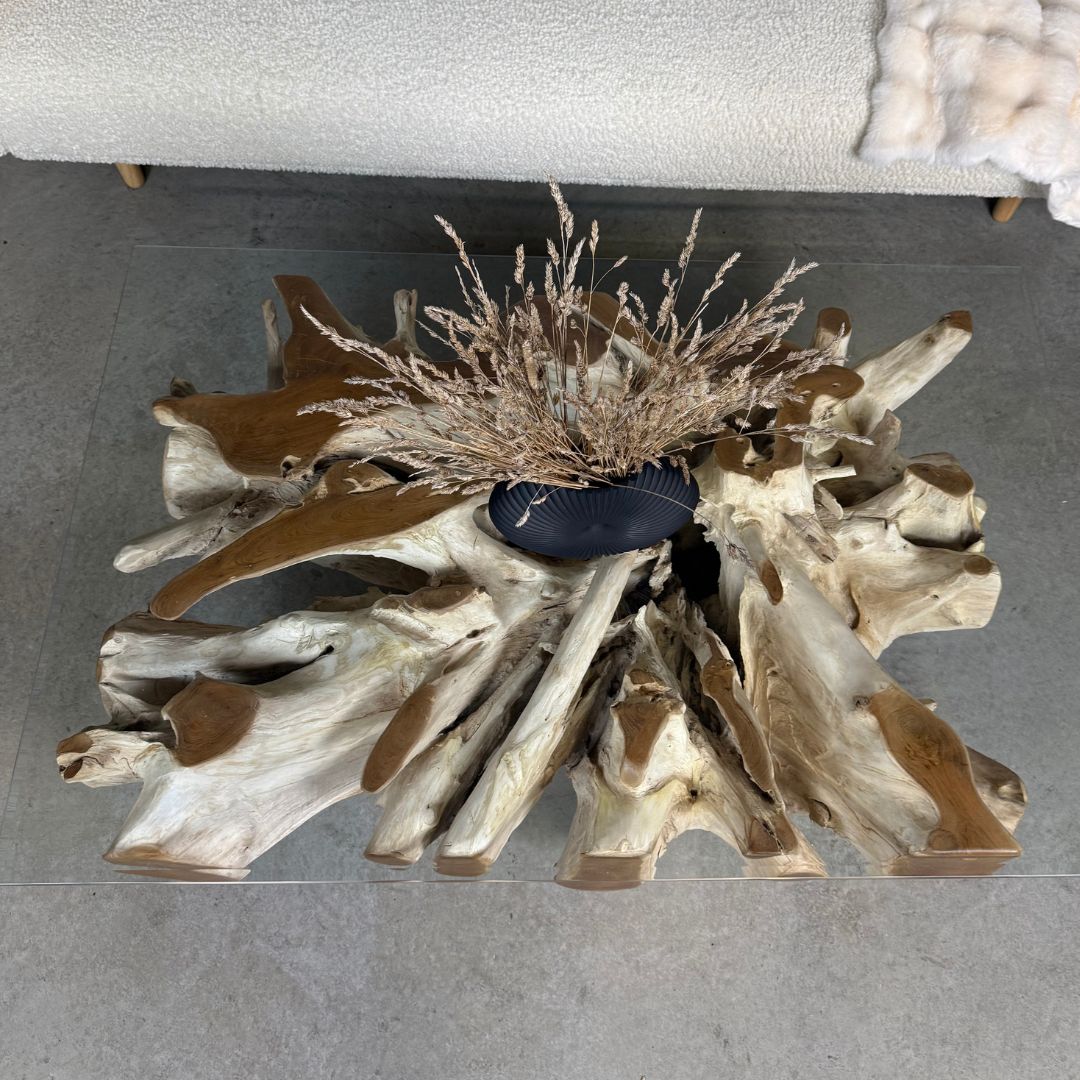 Šis kavos staliukas – tikras natūralios estetikos ir meistriškos formos pavyzdys. Sukurtas iš autentiškos tikmedžio šaknies, jis pasižymi šviesinta natūralia apdaila („bleaching“ efektas), kuri subtiliai išryškina medienos gyslas ir kontrastus. Aiškaus stiklo stalviršis atveria visą šaknies grožį, suteikdamas interjerui skaidrumo ir natūralumo pojūtį. Baldas, kuris tampa kambario akcentu.