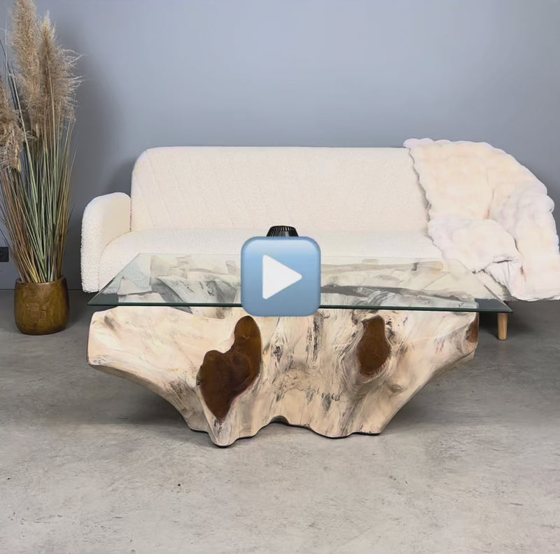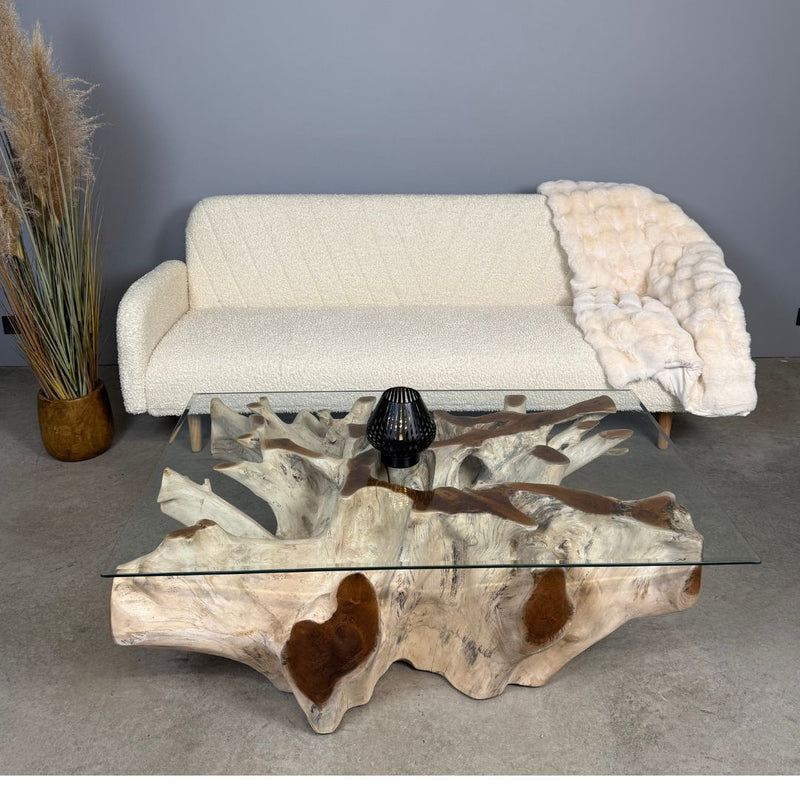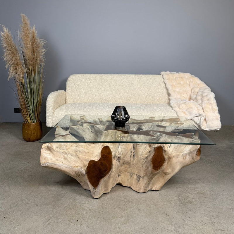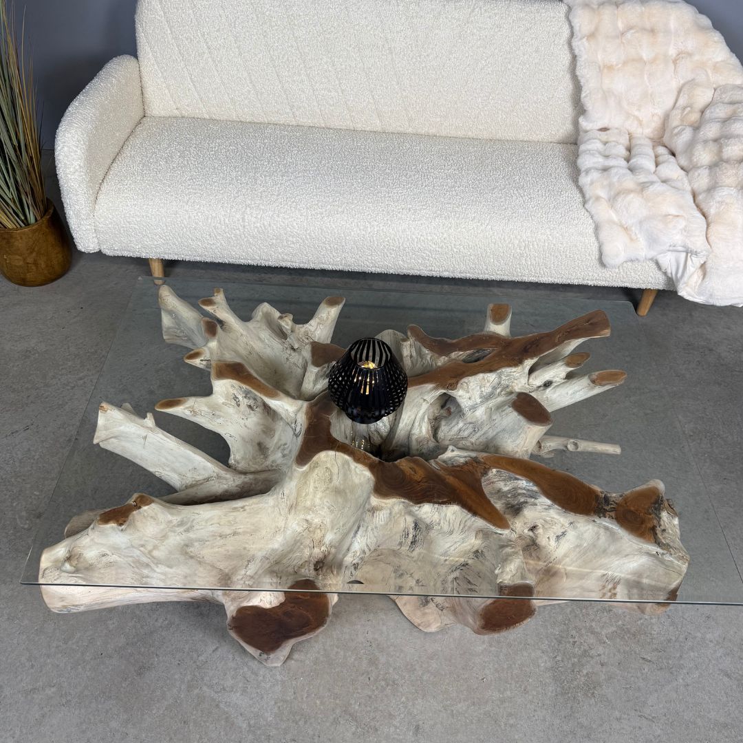 Skulptūriškas kavos staliukas, sukurtas iš natūraliai susiformavusios tikmedžio šaknies. Šviesintas paviršius (bleaching efektas) subtiliai išryškina medžio gyslas ir natūralų charakterį, o aiškaus stiklo stalviršis leidžia visa tai matyti iš bet kurio kampo. Organinis grožis, kuris kuria jaukumą, lengvumą ir ryšį su gamta.