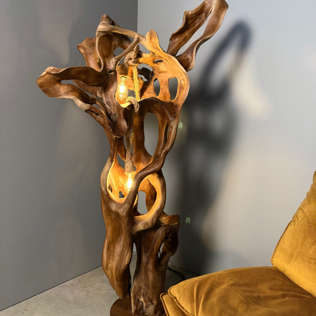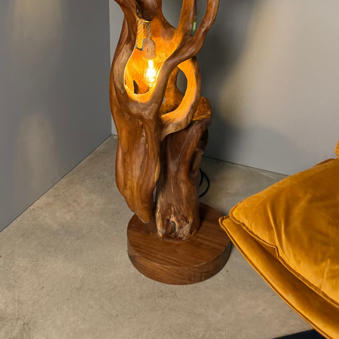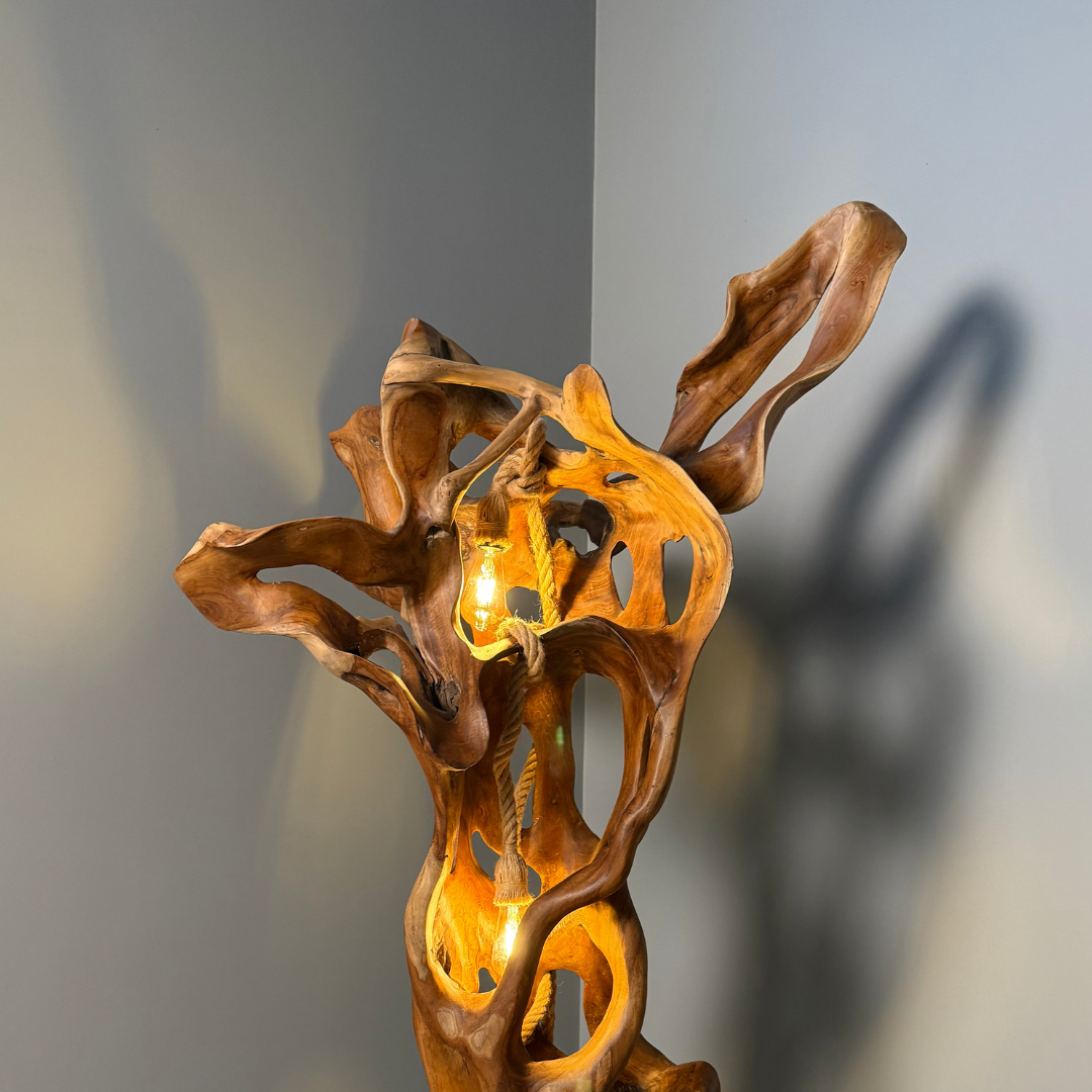 A striking floor lamp handcrafted from solid teak root – a sculptural and organic creation that turns nature into light. Its dramatic shape and raw texture bring depth, warmth, and timeless presence to any space.