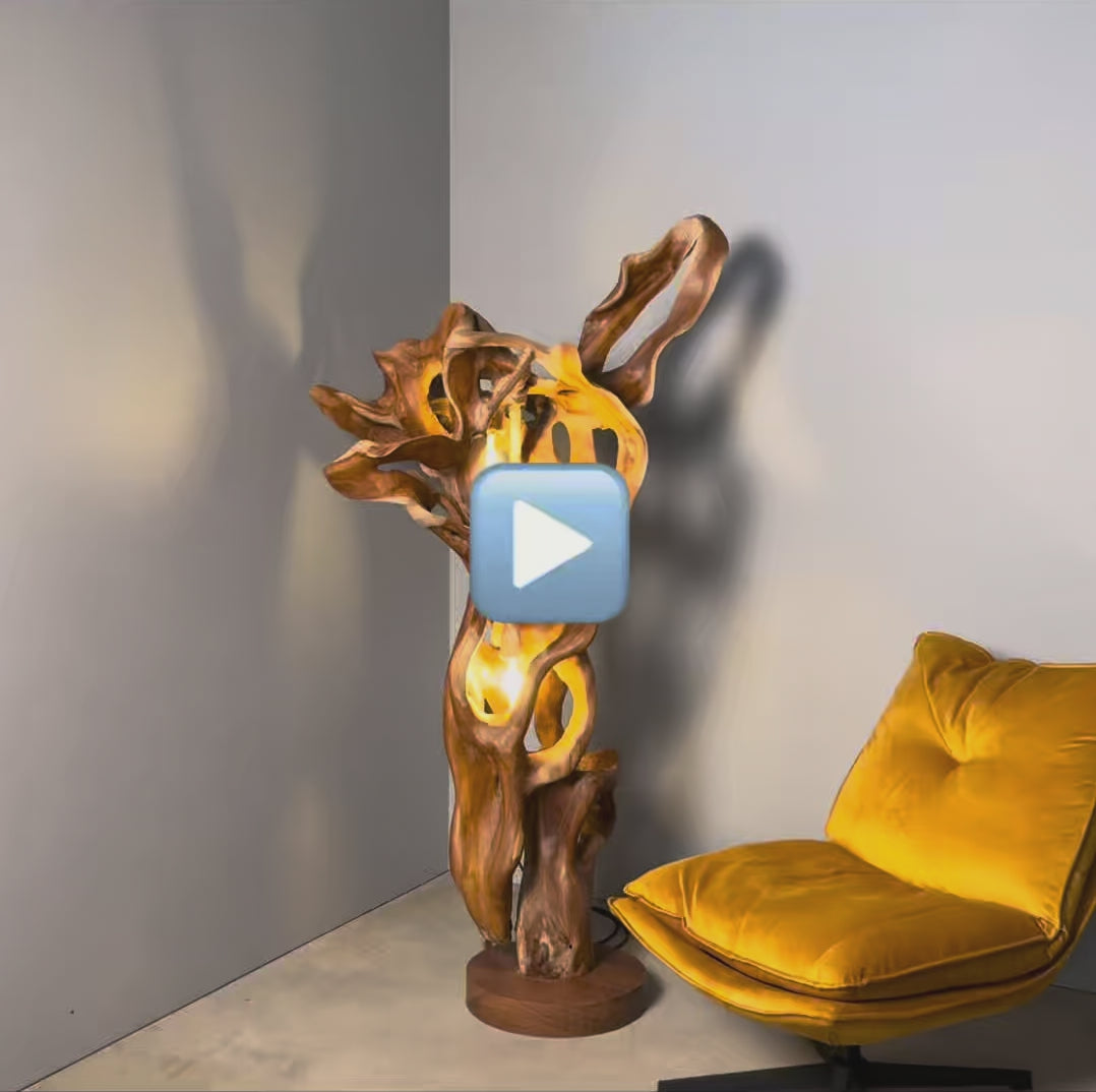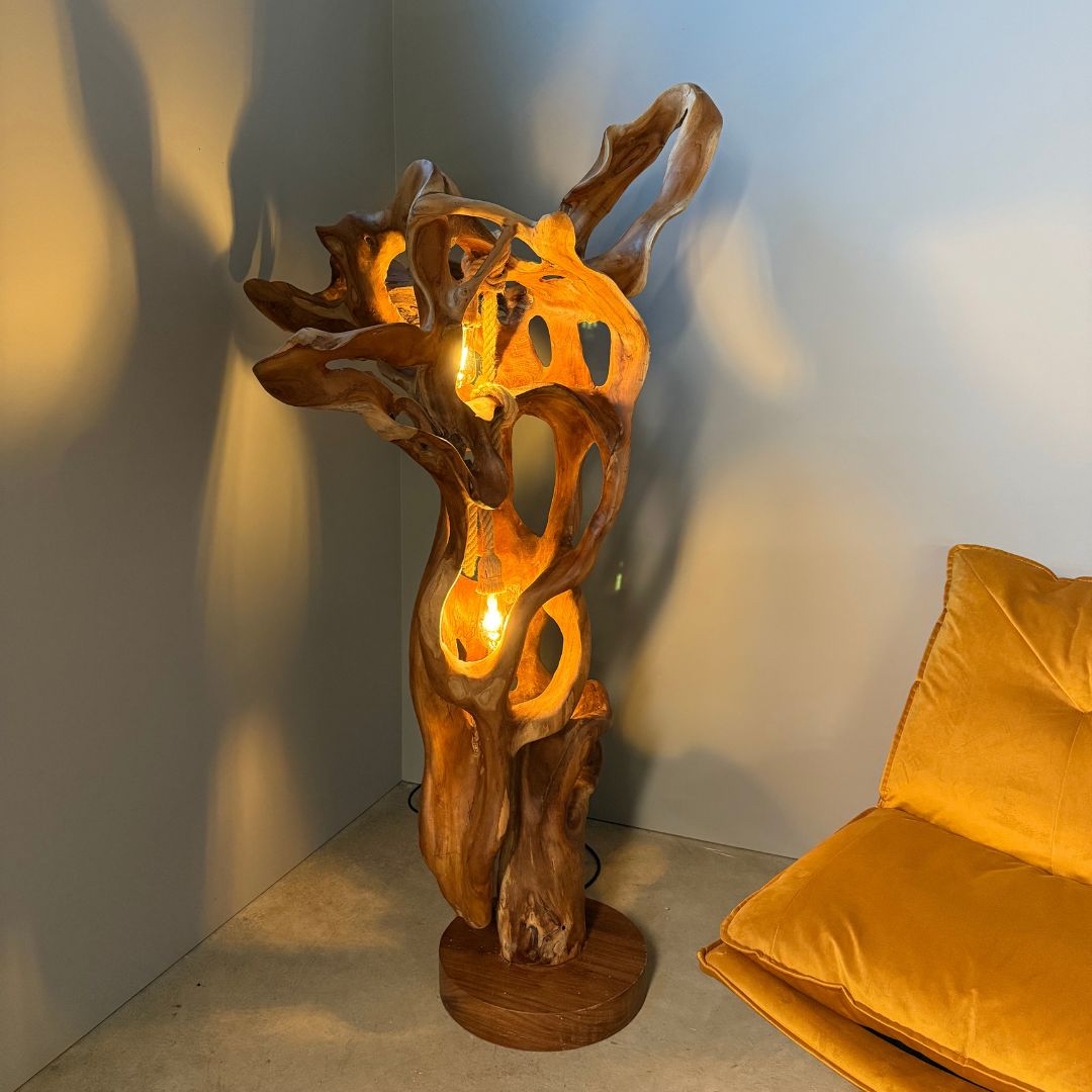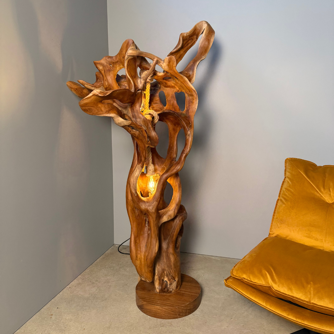 A striking floor lamp handcrafted from solid teak root – a sculptural and organic creation that turns nature into light. Its dramatic shape and raw texture bring depth, warmth, and timeless presence to any space.