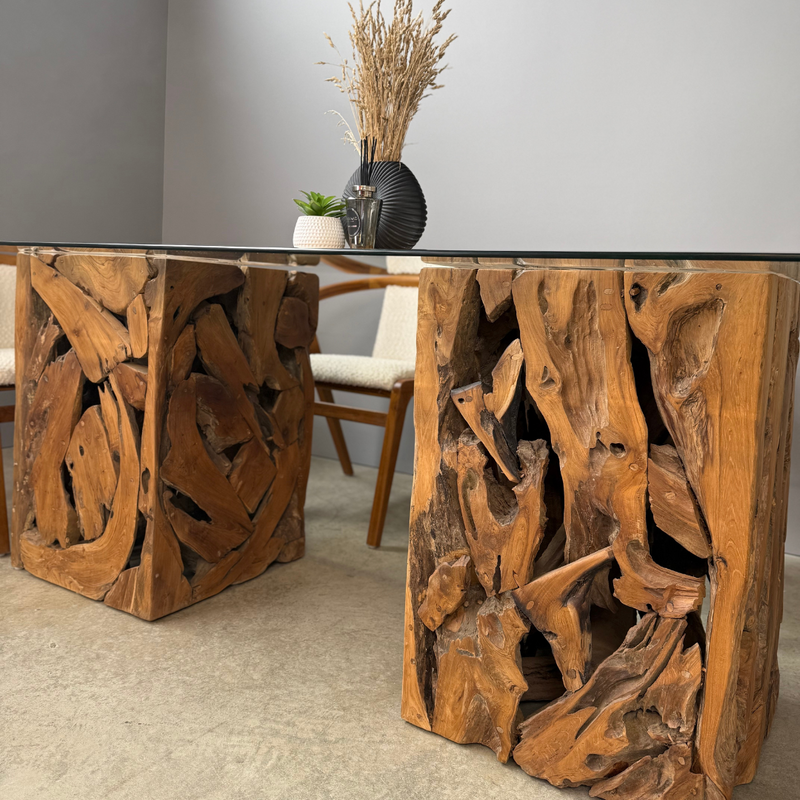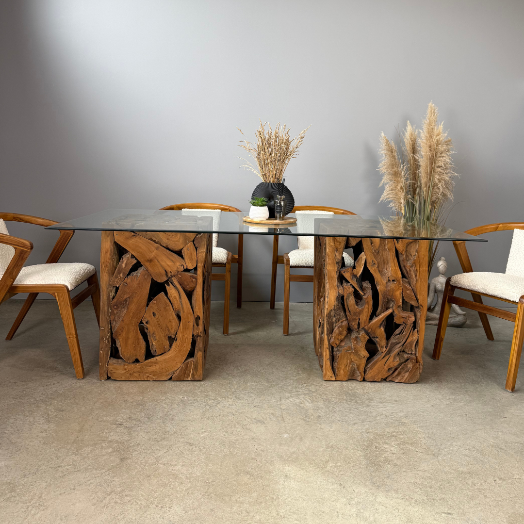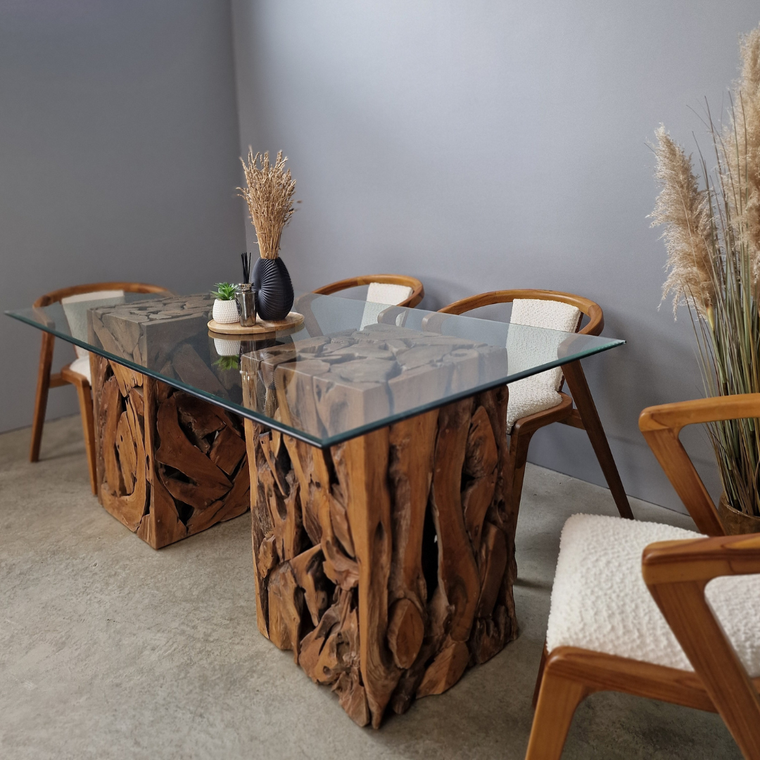 Dining table with two wide legs made from teak root fragments. The glass surface adds lightness, while the whole piece remains bold and solid for your interior.
