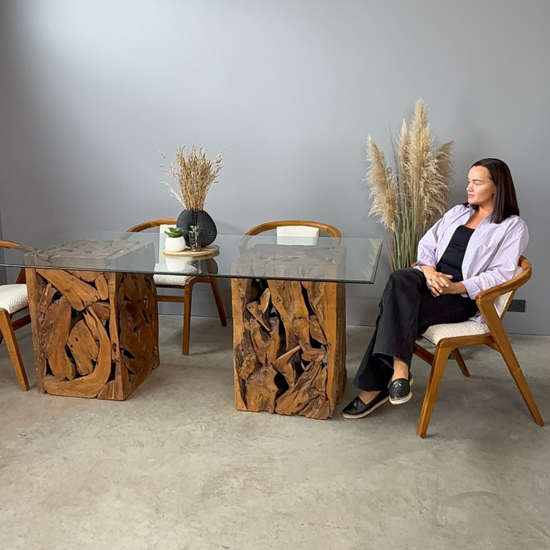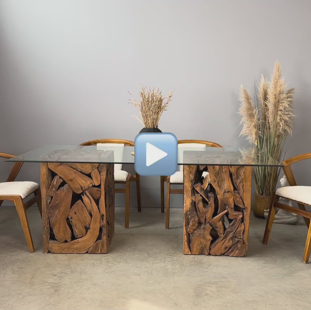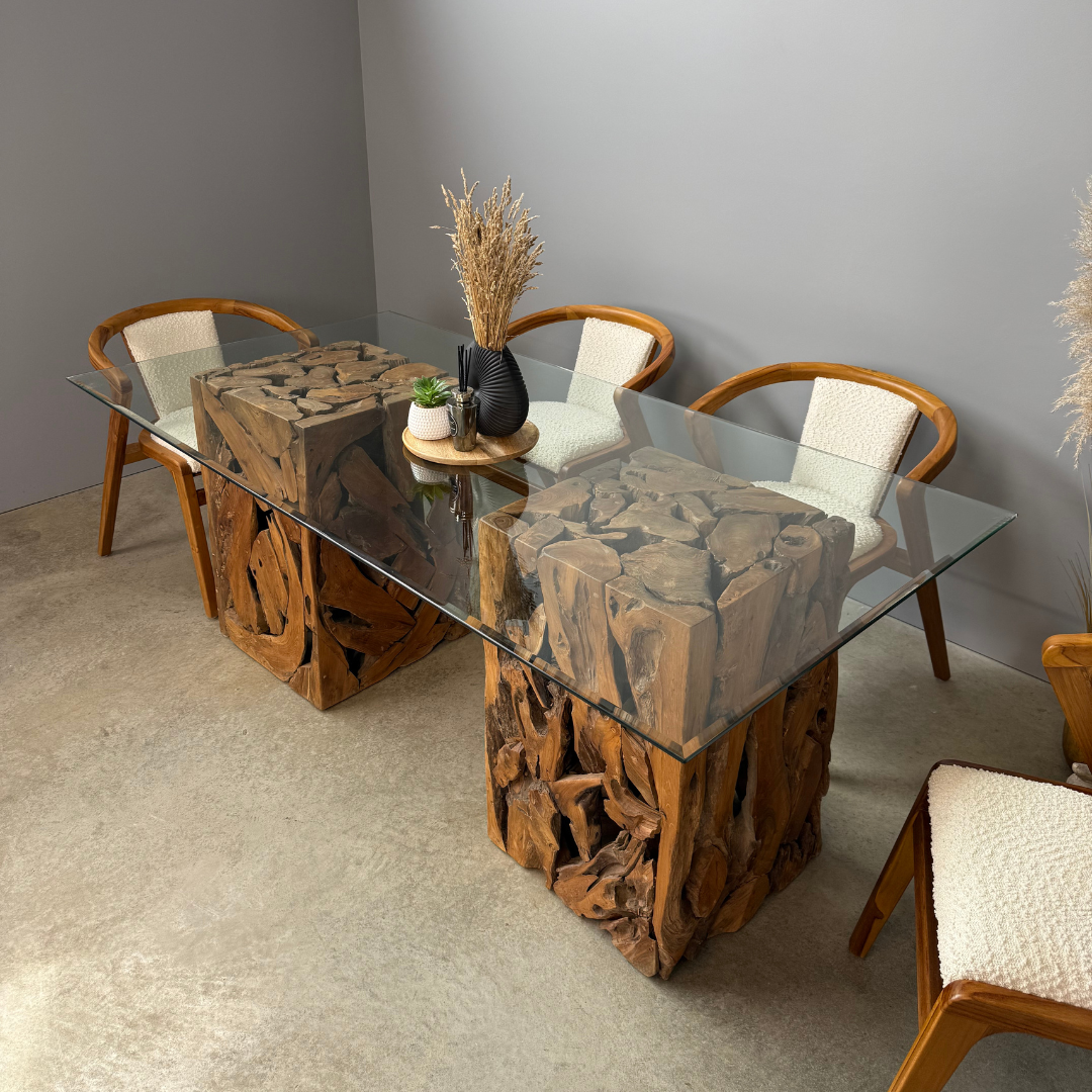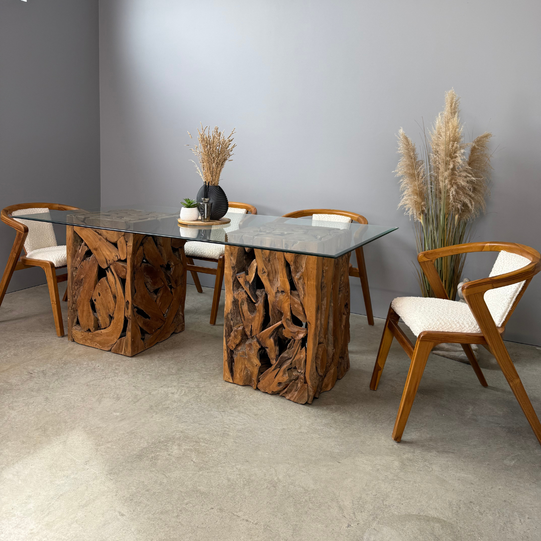 Dining table with two wide legs made from teak root fragments. The glass surface adds lightness, while the whole piece remains bold and solid for your interior.