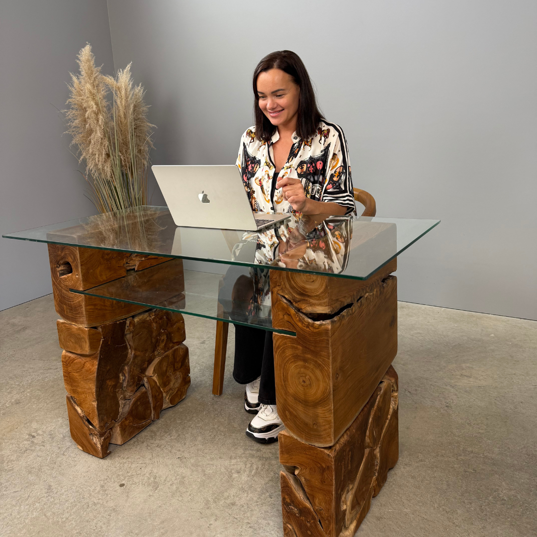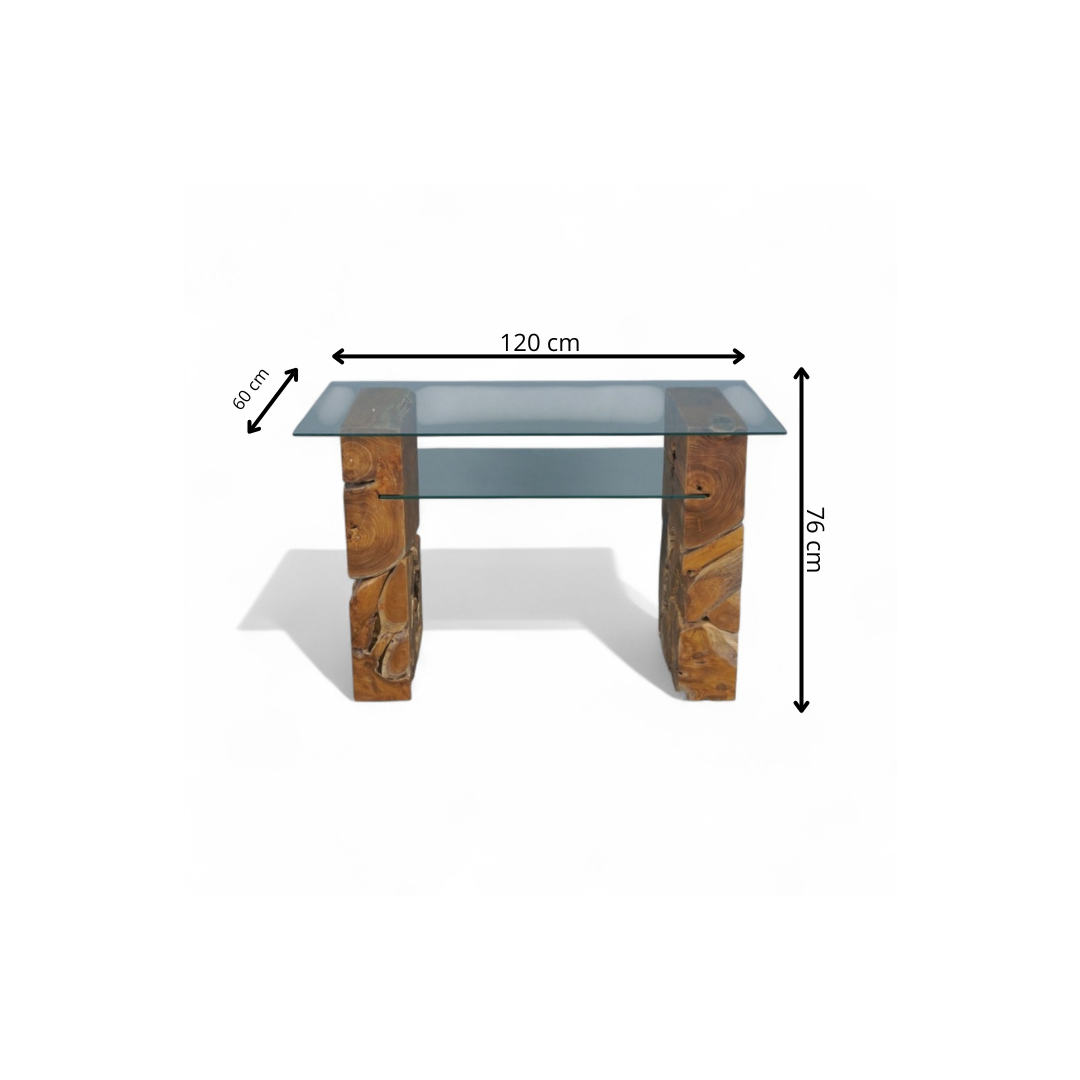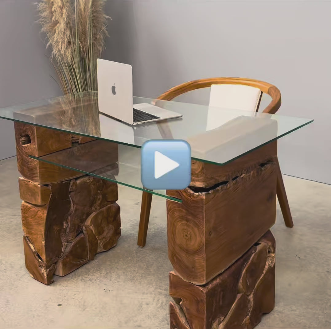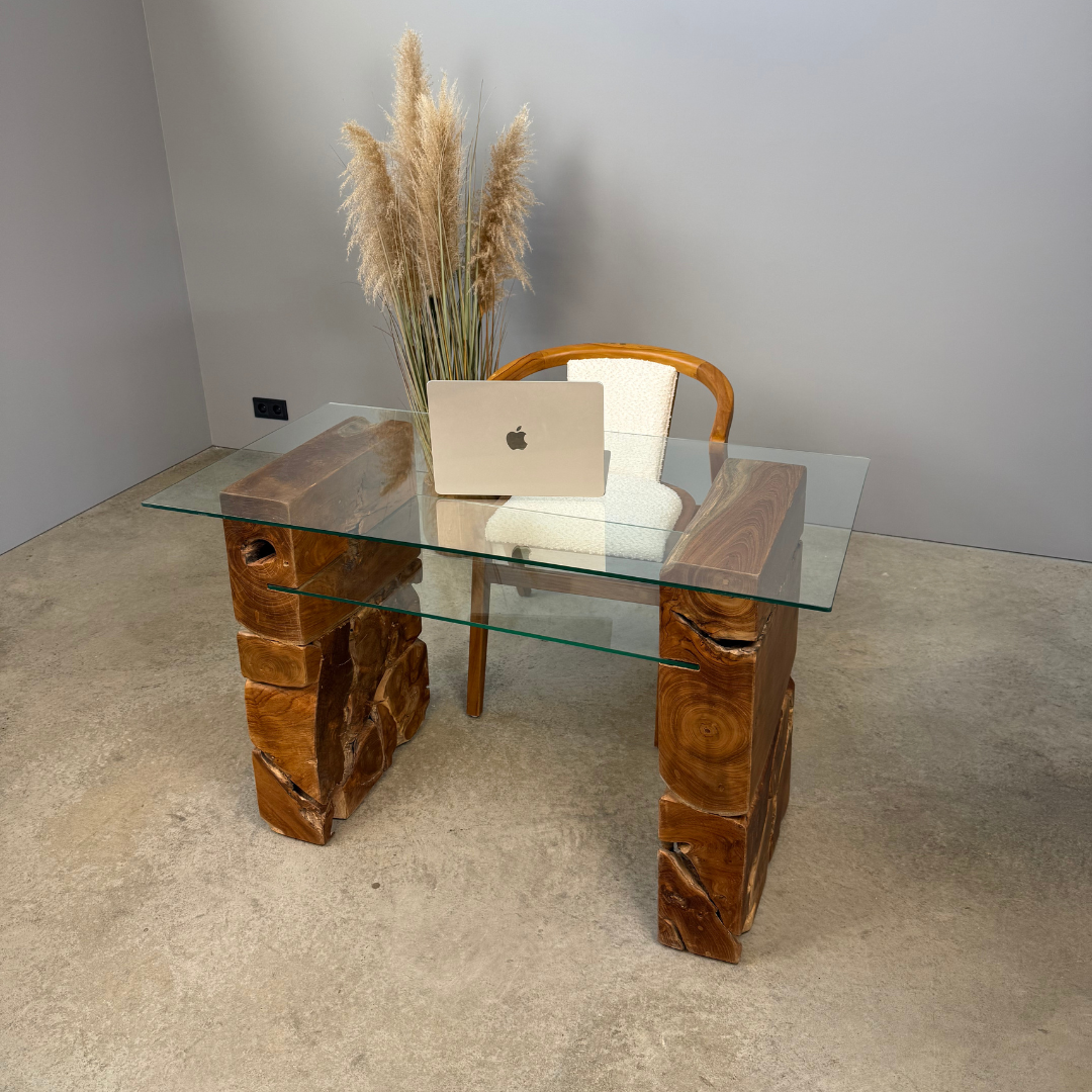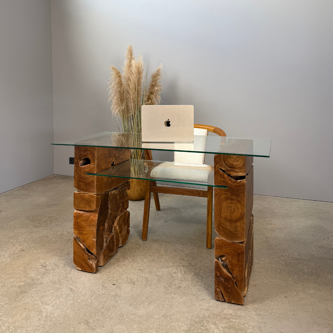 A handcrafted work desk made from natural teak root fragments with double glass surfaces. Each wooden piece retains its unique character, creating a sculptural and grounded presence. Perfect as a distinctive office desk or a refined dining table.
