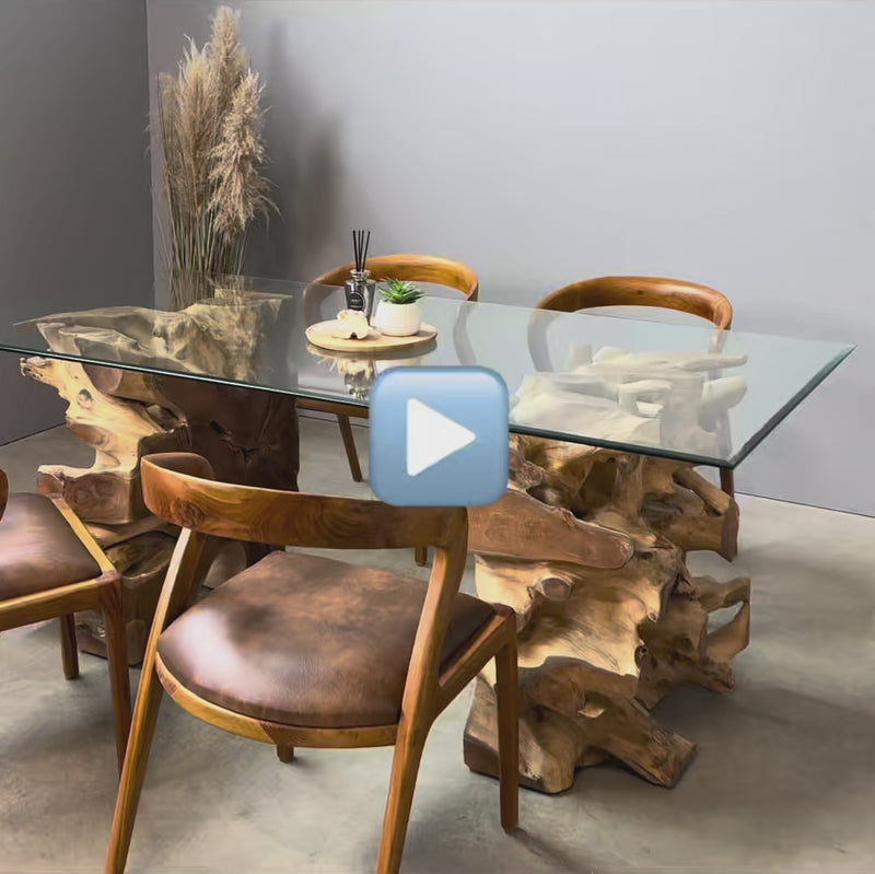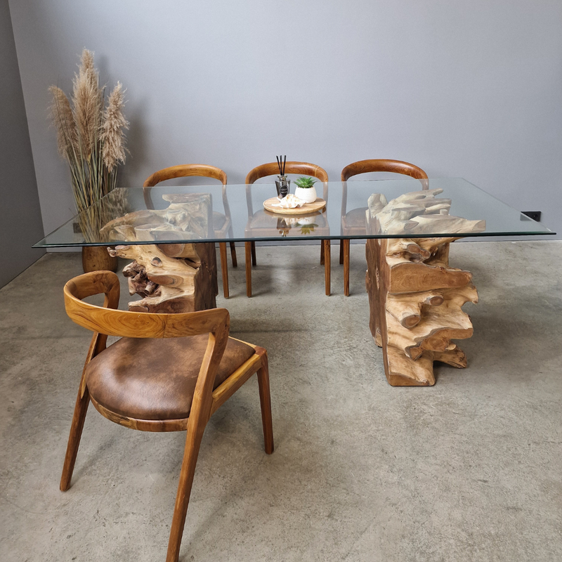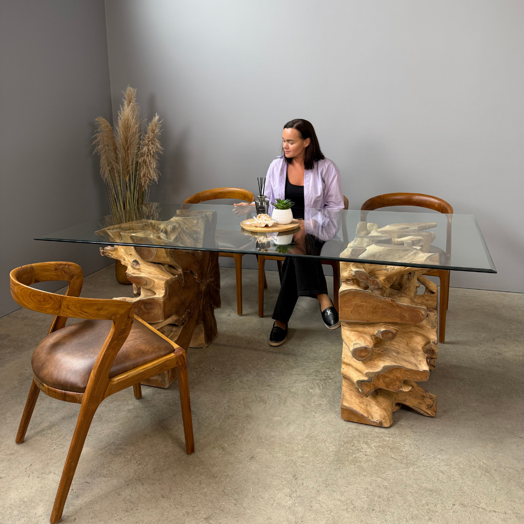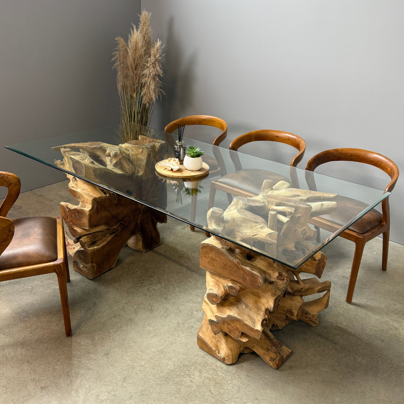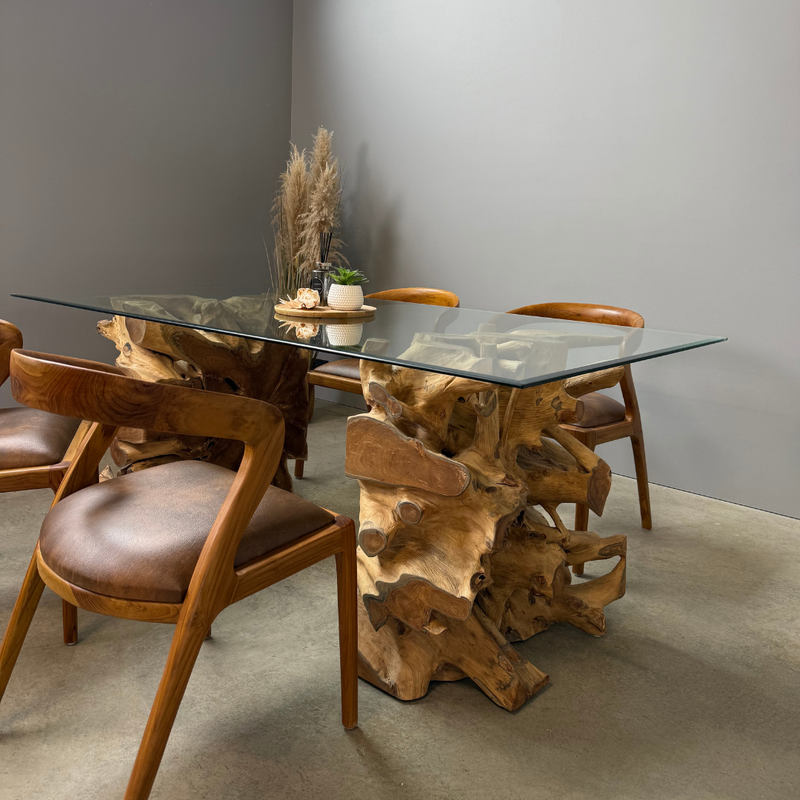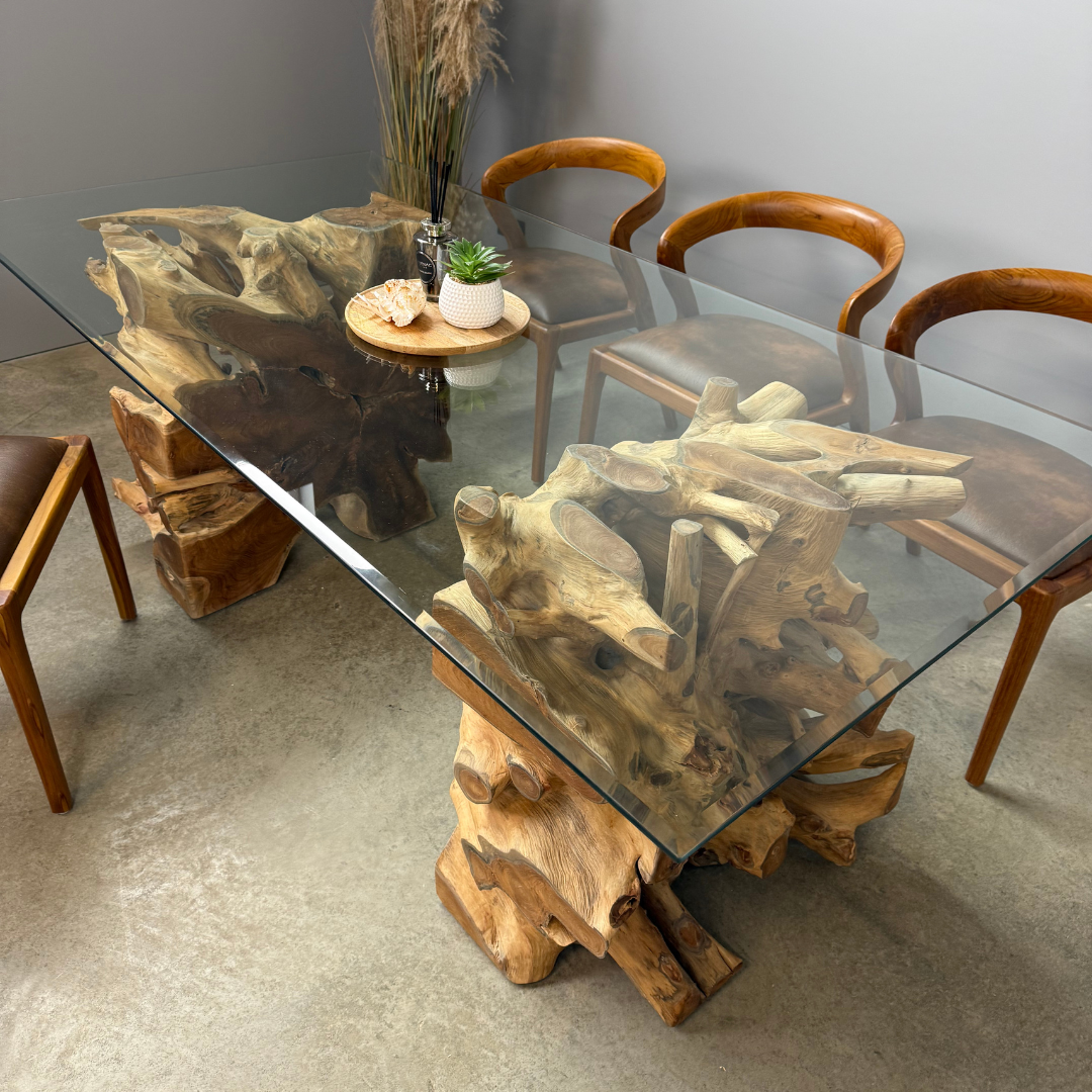 An impressive dining table made from two sculptural teak root bases, each with its own natural character. The transparent glass top gently rests on the organically shaped roots, creating a harmonious contrast between raw nature and elegant functionality. A refined statement for any dining space.
