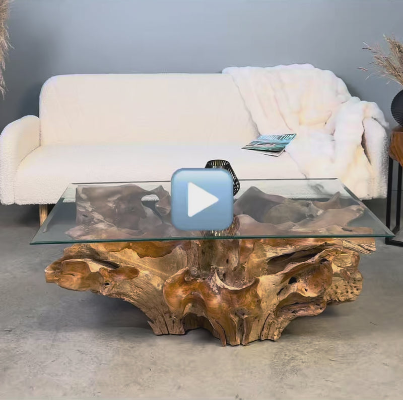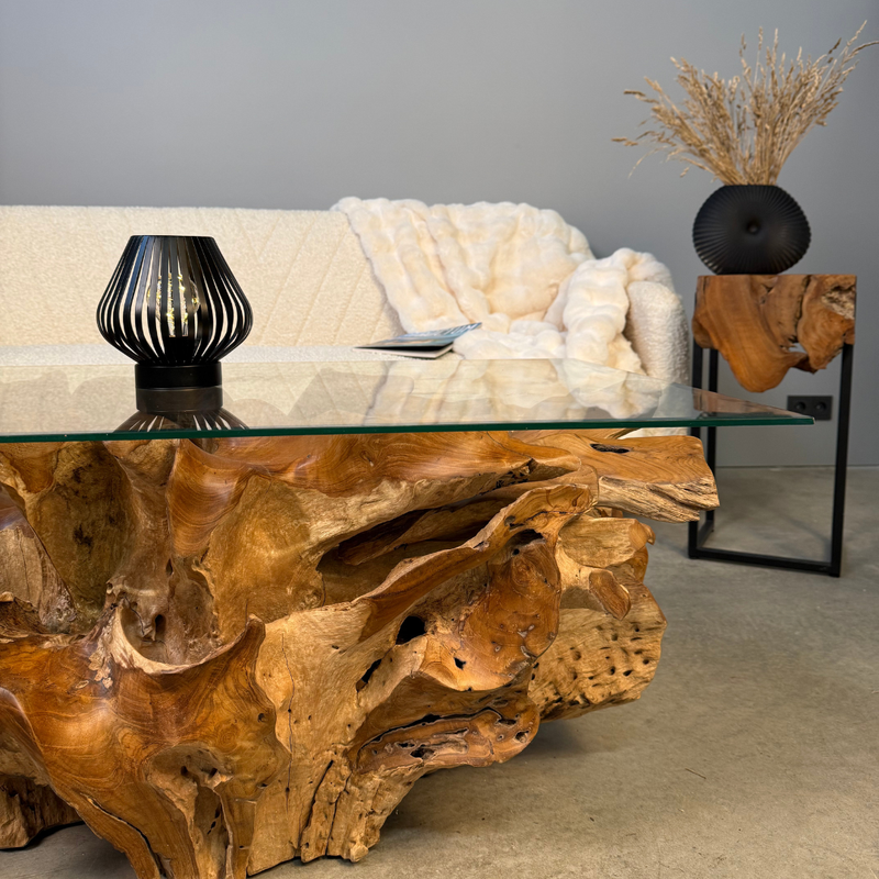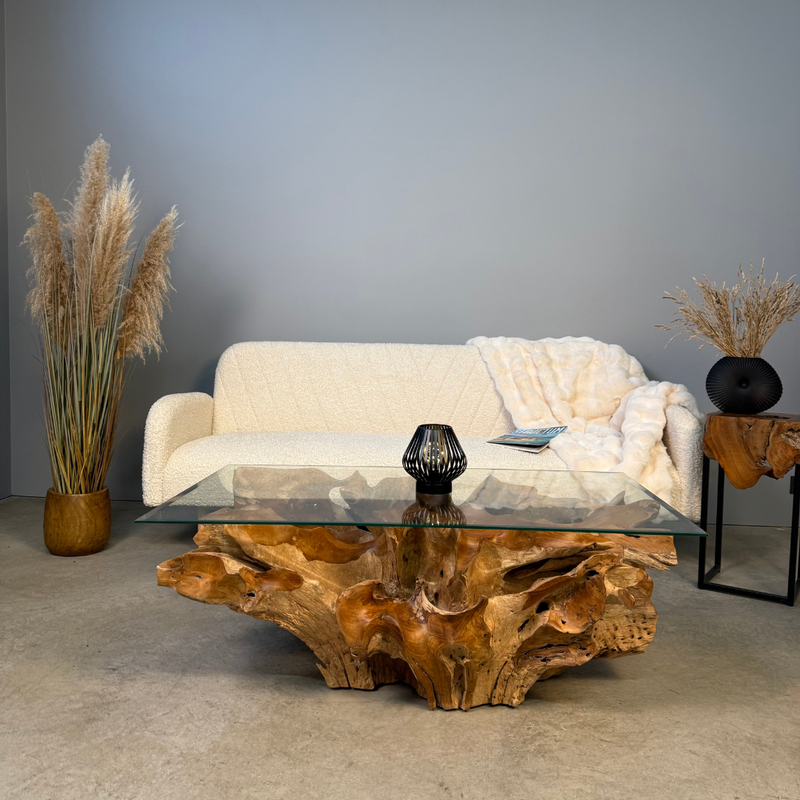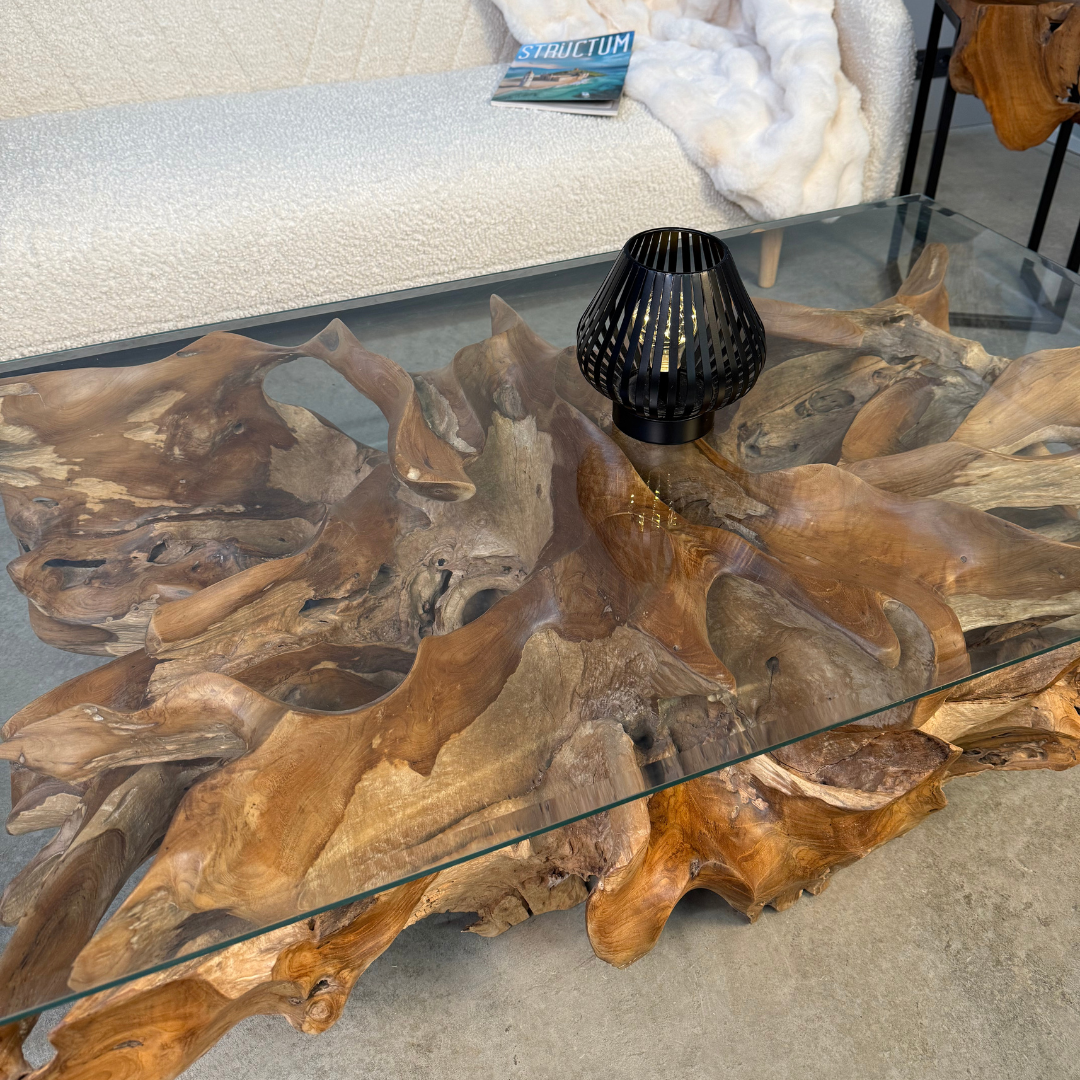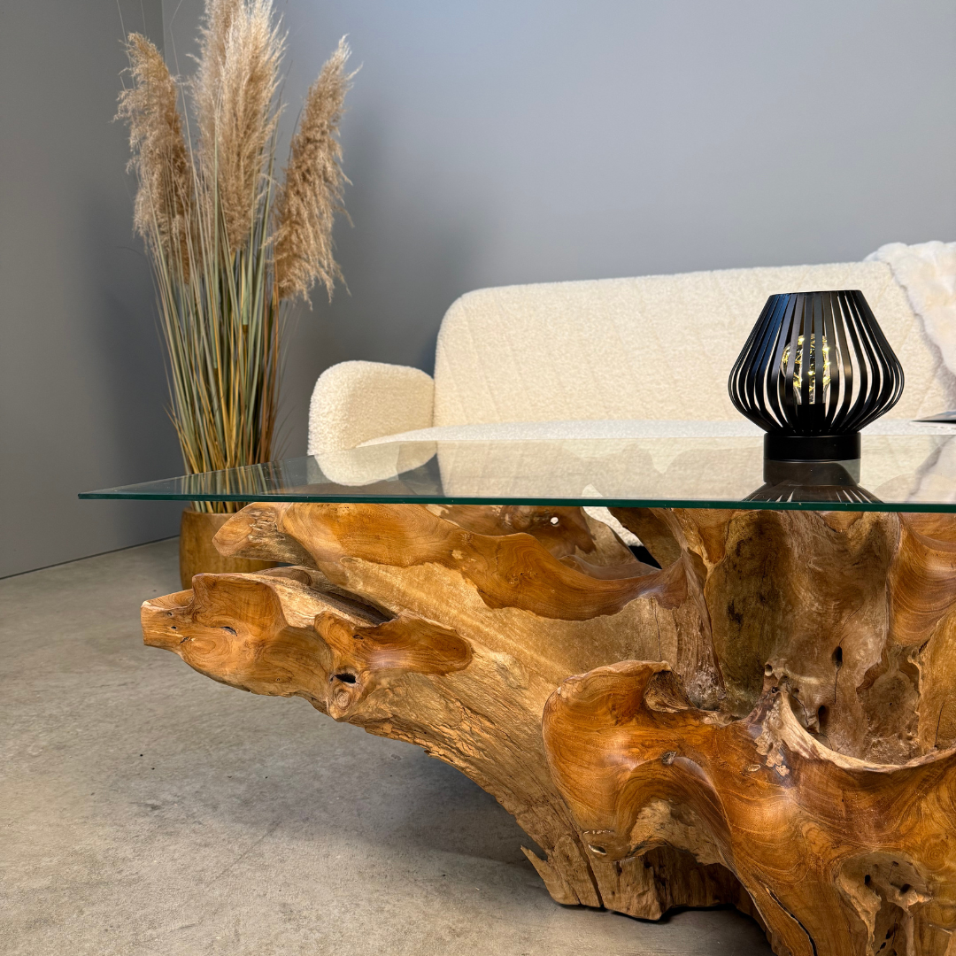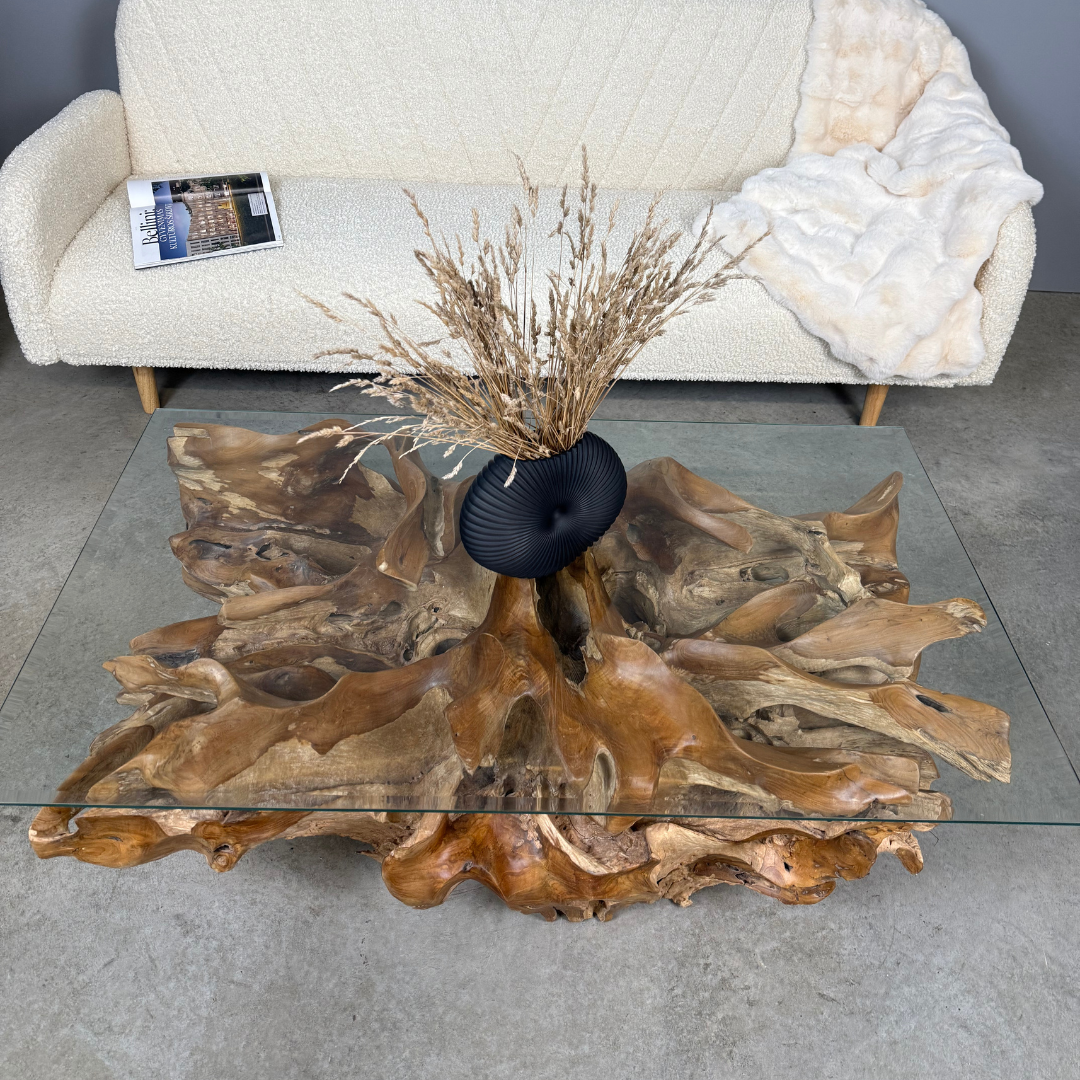 An exceptional coffee table crafted from genuine teak root, shaped by nature in a way that evokes the flow of water – the roots twist and sweep gracefully in one direction. The natural sculptural base is topped with a tempered glass surface that highlights every intricate curve. A remarkable piece of functional art for interiors that celebrate nature and individuality.