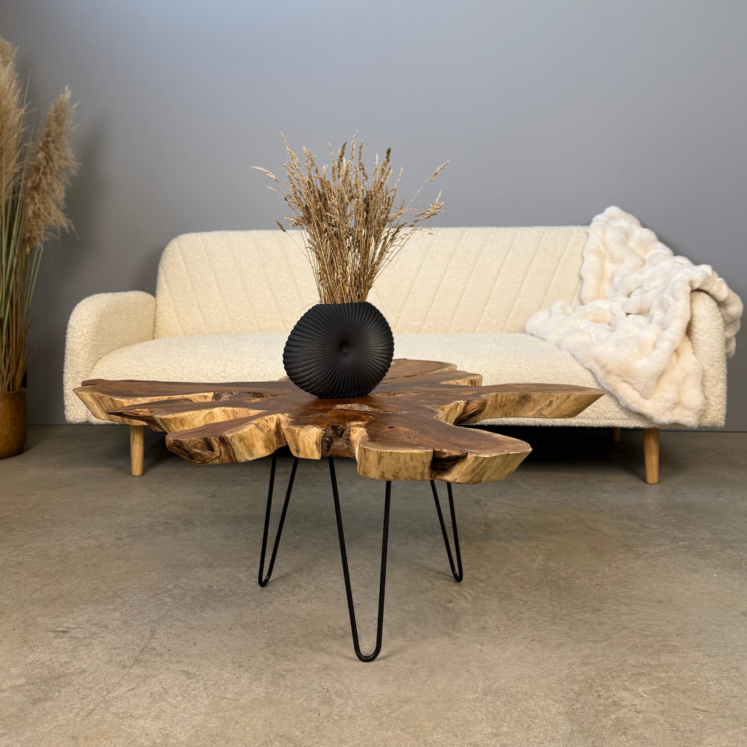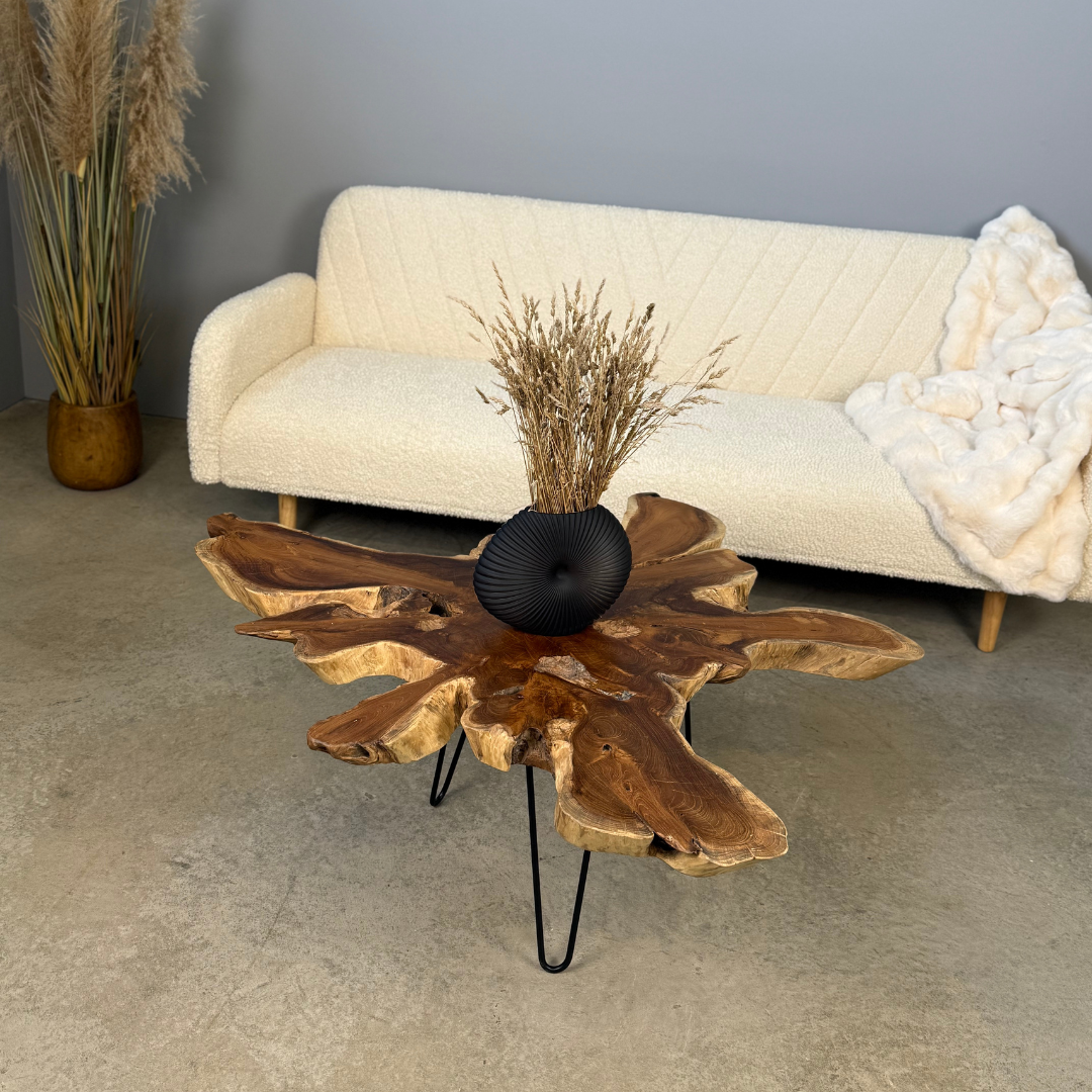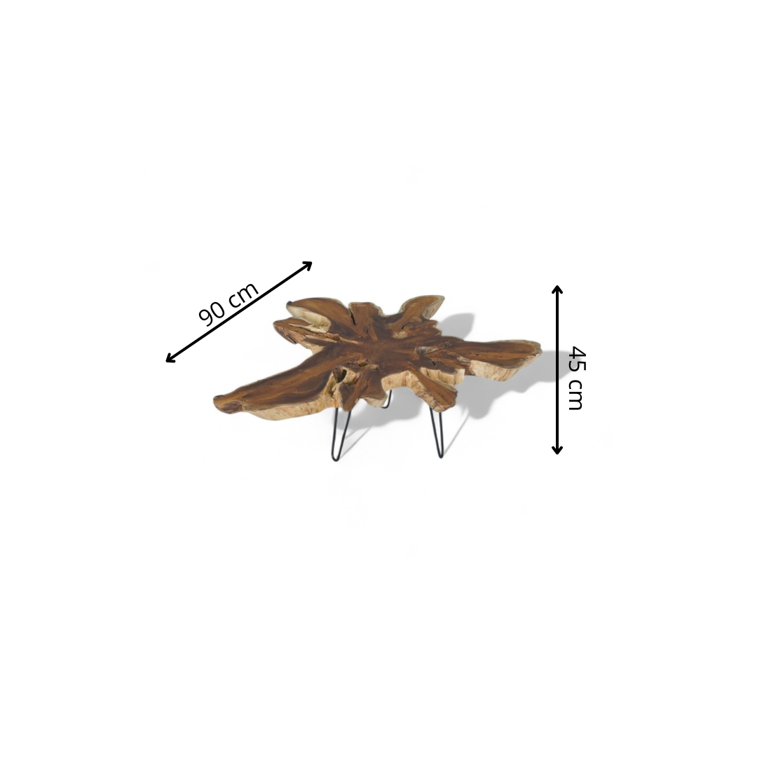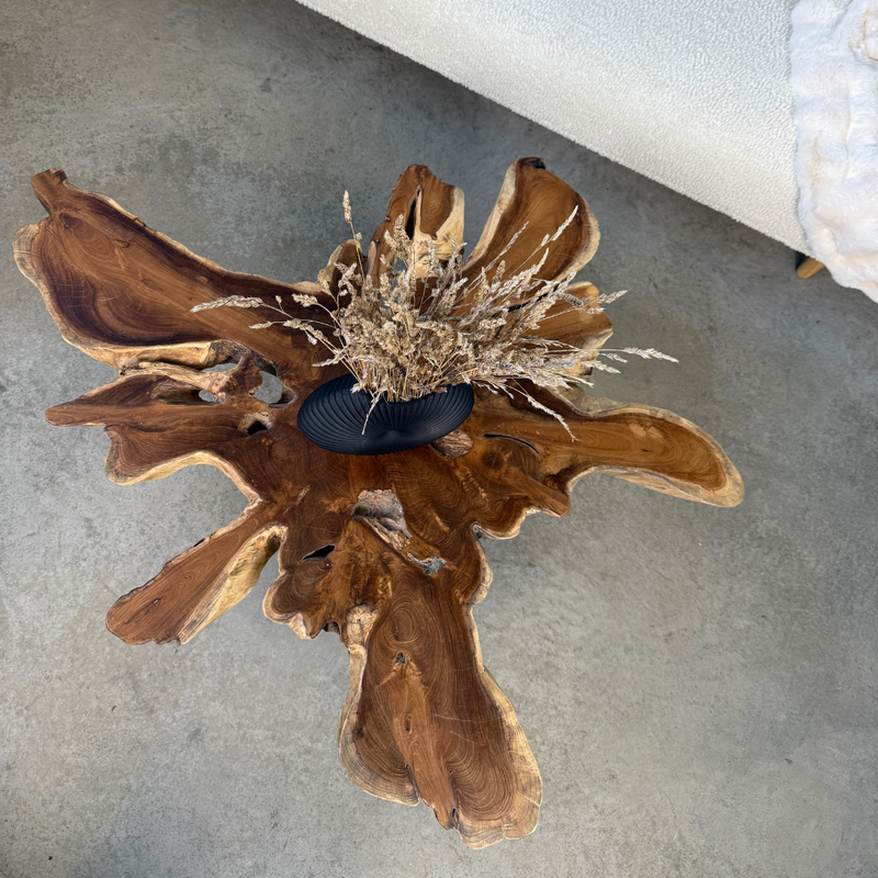 A sculptural coffee table crafted from solid teak wood. Its refined form and expressive wood grain bring warmth and quiet sophistication to any living space. Strong in presence, yet subtly harmonious – it speaks in nature’s language.